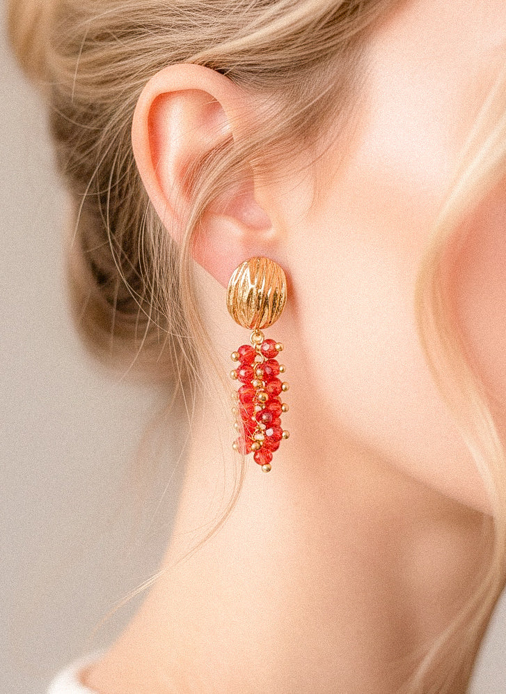 Unos pendientes super originales con una pieza dorada muy especial explosión de bolitas que cuelgan en forma de racimo.